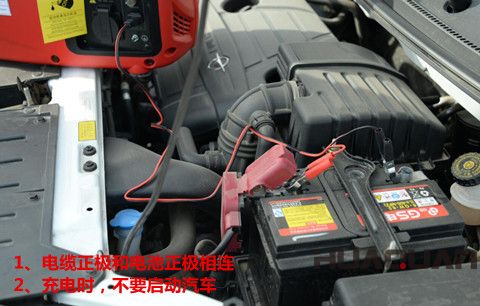 ● 充電電纜的正極與電池的正極相連,不要混淆正負極,否則會嚴重損壞發電機和電池。